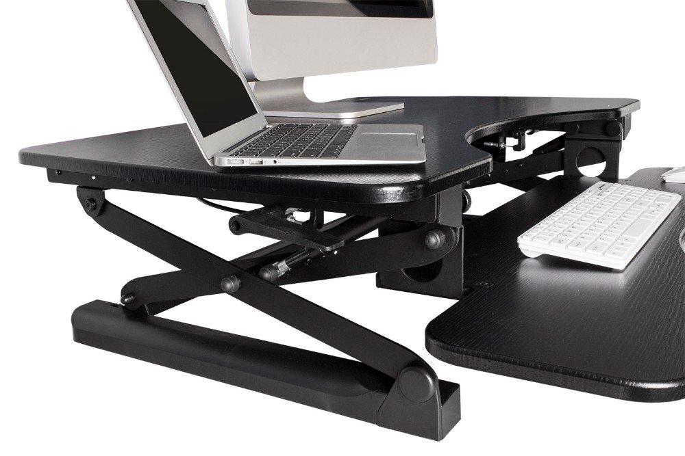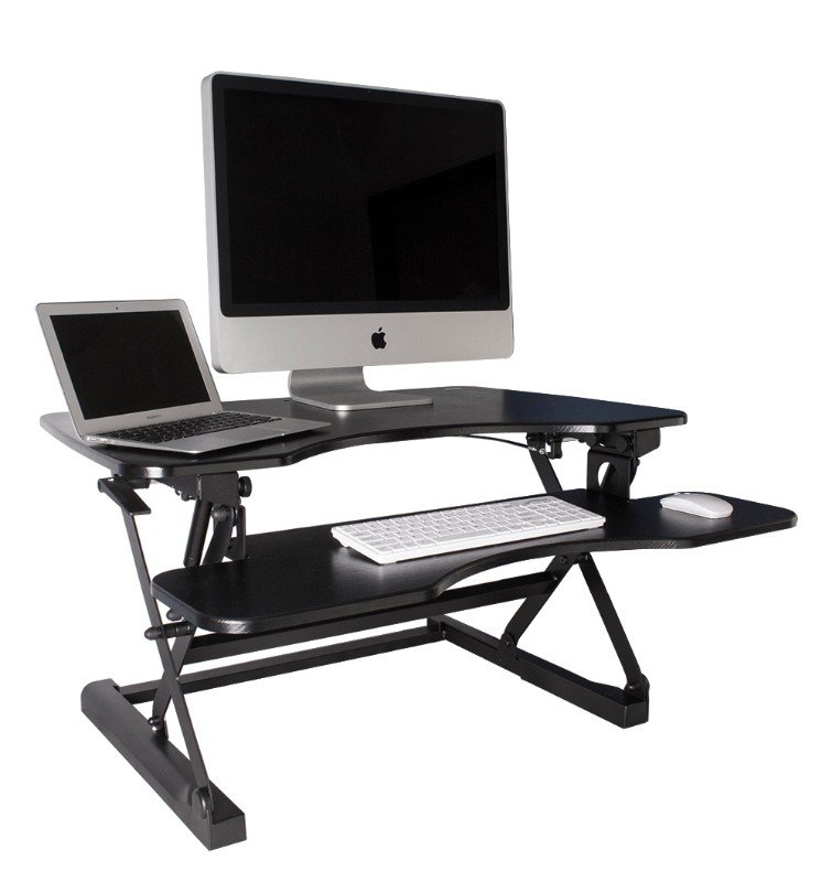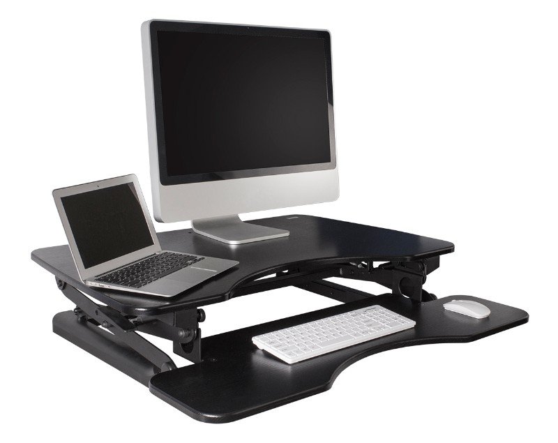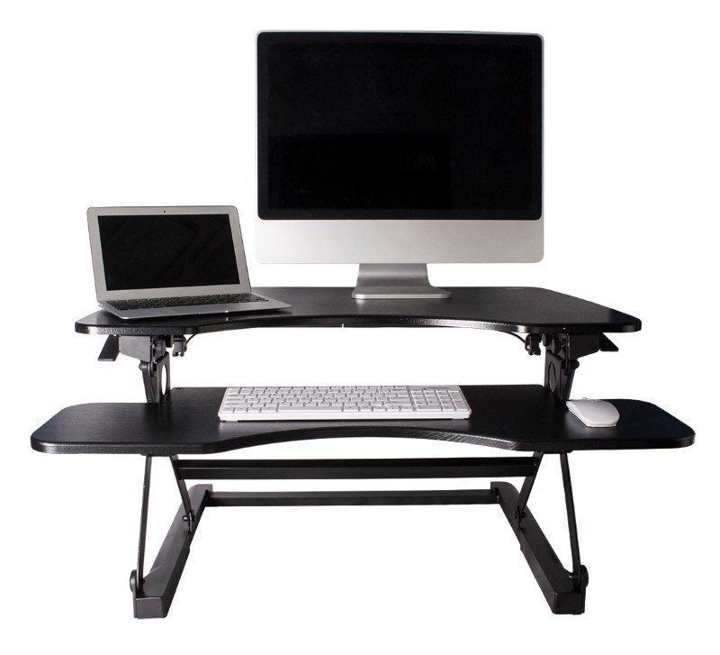 The SSW100D by Monmount is a sit to stand, adjustable height standing desk that helps promote better posture, reduces back and neck pain, and increased productivity. Easily adjusts The SSW100D by Monmount is a sit to stand, adjustable height standing desk that helps promote better posture, reduces back and neck pain, and increased productivity. Easily adjusts to a comfortable height with dual squeeze handles for precise balance.Features Keyboard & Mouse Tray Fully Adjustable from 5.5" to 19.5" Supports up to 90 lbs Stunning Black Wood Finish Able to support dual widescreen MonitorsSpecifications Overall Dimensions: 36in W x 31in D x 5.5in H
