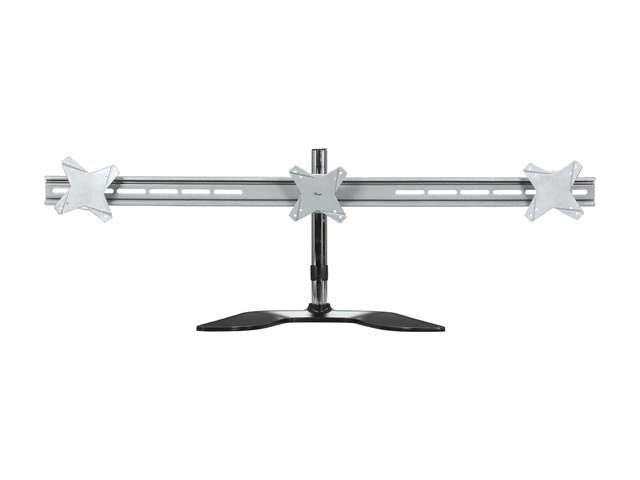 The perfect way to expand your view, the Rosewill RMS-TDM01 desk mount can hold three monitors at a time. It is designed to be placed on the desk with a heavy-duty aluminum base to save your work space. Once installed, the monitor can be tilted or rotated to seamlessly fit your specific needs. The bracket has three mounting plates: one is on the left, one is on the right, and the other is in the center. Attach the bracket to the heavy-duty pole, and mount three monitors at a time to create an expansive viewing experience. The mounting plate supports monitors with VESA 75 x 75mm and 100 x 100mm mounting patterns. Monitors 13- to 23 inches in size, with a maximum weight of 17.6 pounds, can be mounted.